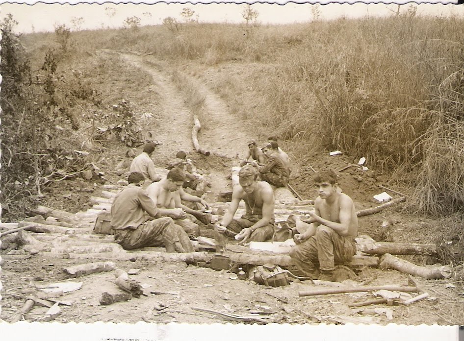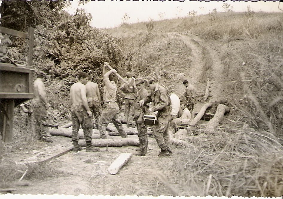 A segunda missão de que participei foi a reconstrução deste mesmo pontão. Mal chegados ao quartel, foi isso mesmo que me tocou em sorte! As fotos que acompanham este postal são, exactamente, dessa altura.