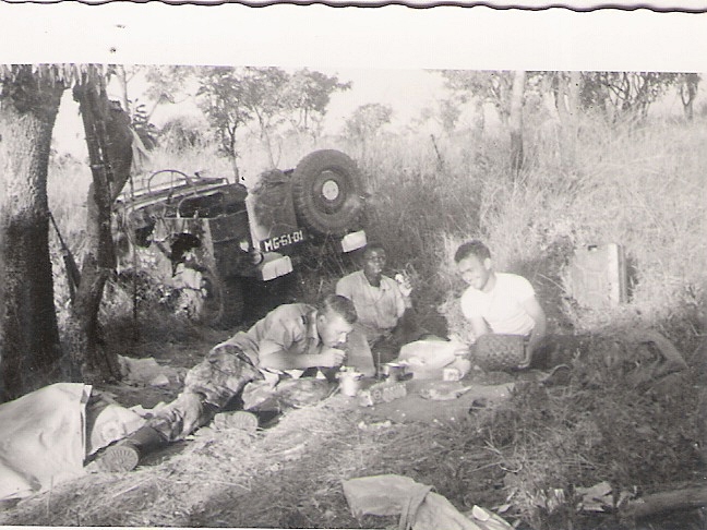 Quando, pela primeira vez, lá nos deslocámos, seguiram dois jeeps, um para lá ficar e um outro para regressar, trazendo o civil de volta ao Mussende. Simpaticamente, o civil trouxera consigo alguns petiscos para um lanche ajantarado, pois saíramos próximo do fim do dia com a intenção de iniciarmos a caçada na manhã seguinte. Coincidiu, a nossa chegada, com o pôr do Sol. Como se sabe, as noites, nos trópicos, caiem muito rapidamente, pelo que, enquanto se preparavam as tendas para dormir e o civil dispunha, sobre o capot do jeep o que tinha trazido para petiscar, caiu a noite. Acenderam-se os farois, para dar um pouco de luz ao local. Eis senão quando se repara que, encadeados pela luz, a cerca de 100 metros, dois magnificos veados estavam como que petrificados. Peguei na mauser, apontei a um deles - estava de lado e fiz-lhe pontaria ao pescoço - e disparei. Rapidamente quiz fazer o segundo tiro, mas enquanto manobrava a culatra deu para ver pelo menos um dos veados correndo para longe, parando de quando em vez e fixando as luzes que os encadearam. Disparei a segunda vez, falhei, com a precipitação, e o animal correu até desaparecer no escuro.